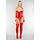Dieses Dessous-Set ist in Rot gehalten und besteht aus einem Top, einem Strumpfgürtel, Strümpfen und einem passenden String. Das Top hat einen glatten Stoff auf der Vorderseite mit weißen, weichen Fasern am oberen Rand. Die Vorderseite ist mit dekorativen Akzenten und einem Rüschenrand versehen. Die Strumpfhalter sind verstellbar. Der String ist aus dem gleichen roten Stoff gefertigt.