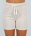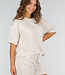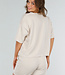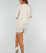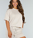 Dieses beigefarbene zweiteilige Set besteht aus einem übergroßen T-Shirt und einer kurzen Hose mit Kordelzug. Das Shirt hat eine lockere, weite Passform mit Rundhalsausschnitt und kurzen Ärmeln. Die passenden Shorts haben einen elastischen Bund mit Kordelzug und gerade Beine. Der Stoff ist glatt, weich und völlig dehnbar, was ihn sehr bequem macht. Der Schnitt fällt locker und ist für einen entspannten, lässigen Look konzipiert.