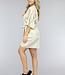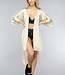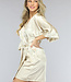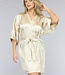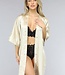 Dieser Kimono hat eine Satinoptik und fällt bis zur Mitte des Oberschenkels. Er hat eine sehr schöne elfenbeinfarbene Farbe. Die Ärmel sind lang und fallen locker. An der Taille befindet sich auf jeder Seite eine Schlaufe, durch die Sie das mitgelieferte Taillenband ziehen können, wenn Sie möchten. Durch dieses Band können Sie wählen, ob Sie den Kimono offen oder geschlossen tragen möchten.