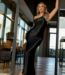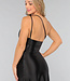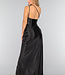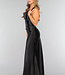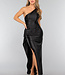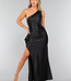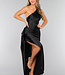 Dieses lange Kleid ist aus Satin gefertigt. Das Kleid hat einen Ein-Schulter-Ausschnitt am Dekolleté. Auf der Rückseite hat das Kleid zwei Träger, die von der linken Schulter über den Rücken zur linken und rechten Taille verlaufen. Am Bauch fällt das Kleid schön drapiert und verleiht ihm ein verspieltes Aussehen. Außerdem hat das Kleid einen herausfordernden, hochgeschnittenen Schlitz. An diesem Schlitz weist das Kleid ein plissiertes Extra-Detail auf. Das Kleid enthält einen feinen Stretchanteil, der es besonders bequem macht.