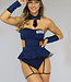 Dieses Kostüm ist für mehrere Anlässe geeignet. Das Kostüm besteht aus einem blauen Body mit fest angebrachten Hosenträgern. Der Body hat einen Bandeau-Ausschnitt. Über dem Body können Sie den mitgelieferten Rock tragen, den Sie mit einer Schleife befestigen können. Zum Set gehören auch Armteile, ein Kragen und nicht zuletzt die Polizeimütze.