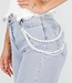 Diese Hosenkette besteht aus vier mehrlagigen Strängen mit Imitationsperlen in verschiedenen Stärken. Die Kette ist mit silberfarbenen Metallhaken versehen, mit denen sie einfach an Gürtelschlaufen befestigt werden kann. Dieses Accessoire eignet sich nicht nur als Hosenkette, sondern kann auch als Taschenkette getragen werden.