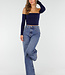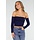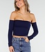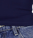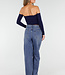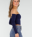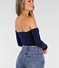 Dieses Oberteil ist aus einem dunkelblauen, glatten Stretch-Stoff und hat eine enge Passform. Es ist schulterfrei, hat einen geraden Ausschnitt mit Pads und lange verbundene Ärmel. Die Schnittlänge fällt knapp über die Taille. Der Rücken ist ganz gerade geschnitten und verläuft bündig mit der Vorderseite. Dank des dehnbaren Stoffes liegt das Top eng am Körper an.
