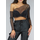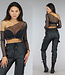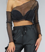 Dieses Oberteil ist voller Glitzer und ist durchsichtig. Die Ränder des Tops haben ein geripptes Detail. Auf der rechten Seite fällt es schulterfrei. Das Top hat einen hohen Stretchanteil.