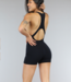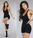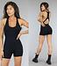 Dieser schwarze Playsuit ist aus einem festen, dehnbaren Stoff gefertigt. Der Playsuit hat einen offenen Rücken und ein tiefes Dekolleté. Der Playsuit enthält herausnehmbare Polster, die das Tragen eines BHs überflüssig machen.
