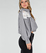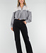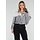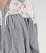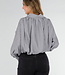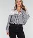 Diese Bluse ist in Schwarz mit vertikalen weißen Streifen gehalten. Das Modell hat einen Kragen und Glitzerknöpfe auf der Vorderseite. Der obere Teil ist mit einem weißen Spitzeneinsatz mit durchbrochener Struktur verziert. Die Bluse hat lange Ärmel mit Manschetten und einen leicht plissierten Ansatz unter dem Spitzenbereich. Der untere Teil ist kurz und gerade geschnitten.