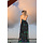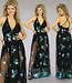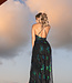 Dieses schwarze Galakleid hat einen Mesh-Overlay, der mit grünen Pailletten besetzt ist. Diese Pailletten verlaufen in einem dekorativen Muster über das Kleid. Es hat einen tiefen V-Ausschnitt und verstellbare Schulterträger, die sich im Rücken kreuzen. Am Rücken befindet sich ein verdeckter Reißverschluss. Das Kleid sitzt oben gut und ist unten locker. Vorne hat der Unterrock zwei hohe Schlitze. Dieses schöne Kleid enthält Stretch.