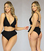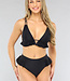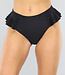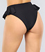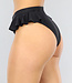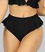 Dieses Bikini-Unterteil hat eine hohe Taille und fällt bis knapp unter den Bauchnabel. Er ist schwarz und aus einem schönen, glatten Stoff gefertigt. An beiden Seiten des Unterteils befinden sich Rüschen, was dieses Bikiniunterteil besonders hübsch macht! Er fällt schön über das Gesäß.