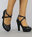 Schlüsselwörter: Schwarze Pumps in Lederoptik, Plateausandalen, klobiger Absatz, Knöchelriemen, Basic, schlicht