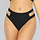 Dieses Bikini-Unterteil hat einen Maxistil und ist einfarbig schwarz. Auf beiden Seiten befinden sich zwei Riemen mit einem Ausschnitt dazwischen. Der Po liegt auf halber Strecke zwischen den Pobacken.