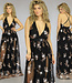 Dieses schwarze Galakleid hat einen Mesh-Overlay, der mit rosa Pailletten besetzt ist. Diese Pailletten verlaufen in einem dekorativen Muster über das Kleid. Es hat einen tiefen V-Ausschnitt und verstellbare Schulterträger, die sich im Rücken kreuzen. Am Rücken befindet sich ein verdeckter Reißverschluss. Das Kleid sitzt oben gut und ist unten locker. Vorne hat der Unterrock zwei hohe Schlitze. Dieses schöne Kleid enthält Stretch.