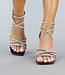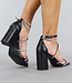 Diese Peeptoe-Sandalen sind aus einem Material in Lederoptik gefertigt und haben einen Peeptoe. Sie haben einen stabilen Blockabsatz und quer über den Vorderfuß verlaufen schmale Riemen, die sich manchmal an verschiedenen Stellen kreuzen. Diese Sandalen haben einen offenen Absatz und die Zehenkappe ist quadratisch. Einzigartig sind die Strasssteine an den Riemchen.