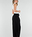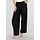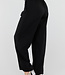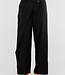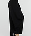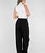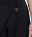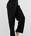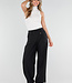 Diese Hose ist in Schwarz gehalten und hat eine Barrel-Passform. Das Modell hat eine hohe Taille mit einem Überwurfdetail auf der Vorderseite, das mit einem Knopf geschlossen wird. Auf der Vorderseite sind dezente Falten eingearbeitet, die für zusätzliche Weite um die Hüften sorgen. Die Hose ist leicht ausgestellt und verjüngt sich zum Knöchel hin. Der Bund ist elastisch. Der Stoff hat eine glatte Struktur und fällt geschmeidig am Körper entlang.