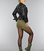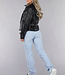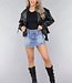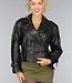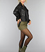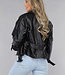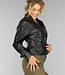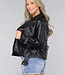 Diese Jacke in Lederoptik ist kurz geschnitten. Sie hat einen Umlegekragen und lange Ärmel, ist mit einem Knopfverschluss versehen und hat zwei Taschen mit Reißverschluss. Außerdem hat sie eine Ziertasche auf der Vorderseite. Am unteren Ende der Jacke sowie an den Ärmeln befindet sich ein Gürtel.