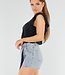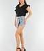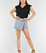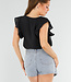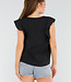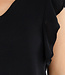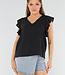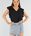 Diese schwarze Bluse hat einen V-Ausschnitt und eine gerade, lockere Passform. Die Ärmel sind kurz und mit dezenten Rüschen versehen. Der Stoff fällt weich und ist luftig. Die Rückseite der Bluse ist schlicht. Sie fällt auf die Hüfte und kann entweder in oder über Hosen oder Röcken getragen werden.
