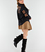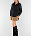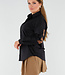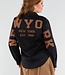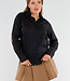 Diese schwarze Bluse ist aus glatter, gewebter Baumwolle gefertigt und hat eine gerade Passform. Die Bluse wird vorne mit einer Reihe von schwarzen Knöpfen geschlossen und hat einen klassischen Kragen. Auf dem Rücken und den Ärmeln sind große camelfarbene Aufnäher angebracht, die den Schriftzug "NEW YORK" bilden, mit zusätzlichem Text "NEW YORK EST 1992" in der Mitte des Rückens. Die Ärmel sind lang und haben Knopfmanschetten. Der Saum ist leicht abgerundet und fällt über die Hüfte.
