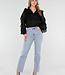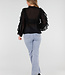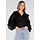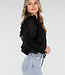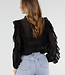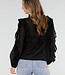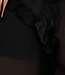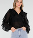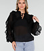 Diese Bluse ist aus schwarzem, leicht transparentem Chiffon gefertigt. Das Modell hat lange Ärmel mit elastischen Bündchen und ist mit vertikalen Rüschen entlang der Vorderseite und an den Ärmeln verziert. Der Ausschnitt hat einen kleinen Schlitz mit einer Schleifebindung. Die Bluse hat eine gerade Passform und fällt locker um den Körper. Der Stoff ist geschmeidig und leicht strukturiert.