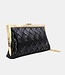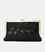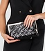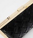 Diese schwarze Clutch ist aus geflochtenem Kunstleder gefertigt und mit einem glänzenden goldfarbenen Metallrand eingefasst. Die Tasche lässt sich mit einem Klickverschluss an der Oberseite sicher verschließen und wird mit einer abnehmbaren goldfarbenen Schulterkette geliefert, sodass die Clutch sowohl in der Hand als auch über der Schulter getragen werden kann. Das kompakte Design ist ideal für das Mitnehmen von wichtigen Utensilien und sorgt dank des Flechtmusters für einen strukturierten Look. Die Kombination aus schwarzem Grundton und goldenen Details macht dieses Accessoire vielseitig und zeitlos.