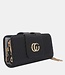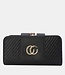 Diese Clutch in Schwarz ist aus geflochtenem Kunstleder gefertigt und mit einer goldfarbenen Kette verziert. Die Tasche hat eine rechteckige Form mit beigem Innenfutter und bietet ausreichend Platz für Ihr Handy und kleine Utensilien. Auf der Vorderseite befindet sich eine Klappe mit goldfarbenem Akzent, die der Clutch einen luxuriösen Look verleiht. Dank der abnehmbaren Schulterkette kann die Tasche sowohl in der Hand als auch als Crossbody-Tasche getragen werden.