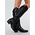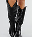 Diese schwarzen Cowboystiefel sind aus einem glatten Material in Lederoptik gefertigt. Der Schaft ist mittelhoch und mit dekorativen Nähten in einem typischen Westernmuster versehen. Das Modell hat eine abgerundete, eckige Spitze, einen stabilen, niedrigen Blockabsatz und zwei Zugschlaufen am oberen Rand. An der Innenseite befindet sich ein Reißverschluss zum einfachen An- und Ausziehen.