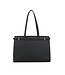 Diese schwarze Einkaufstasche ist aus einem strukturierten Material in Lederoptik gefertigt und hat ein geräumiges, rechteckiges Design. Die Tasche verfügt über zwei lange Schulterriemen, sodass sie bequem über der Schulter getragen werden kann. An der Oberseite ist die Tasche mit einem schmalen Band mit goldfarbenen Schnallenverschlüssen als Detail versehen, während die Rückseite über ein Reißverschlussfach für zusätzlichen Stauraum verfügt. Der Boden ist verstärkt und mit vier goldfarbenen Schutzknöpfen versehen. Mit den sauberen vertikalen Nähten und klaren Linien ist dies eine praktische Tasche mit einem gepflegten Aussehen.