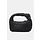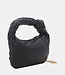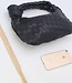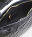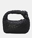 Diese schwarze Umhängetasche ist aus geflochtenem Kunstleder gefertigt und hat eine kompakte, abgerundete Form. Der kurze Henkel ist mit einem auffälligen Knopfdetail versehen, während die Oberseite mit einem goldfarbenen Reißverschluss verschlossen wird. Neben dem kurzen Griff verfügt dieses Modell über einen zusätzlichen abnehmbaren langen goldenen Kettengriff, sodass die Tasche auch als Umhängetasche getragen werden kann. Das geflochtene Muster verleiht der Tasche ein strukturiertes Aussehen, während die geschmeidige Verarbeitung für einen modernen Look sorgt.