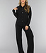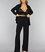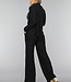 Diese Hose ist aus einem luftigen Stoff gefertigt und mit Glitzersteinen besetzt. Die Hose ist schwarz und hat weite Beine. Die Hose hat einen elastischen Bund und zwei Seitentaschen.