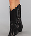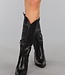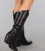 Diese Stiefel fallen bis knapp unter das Knie und sind aus einem Material in Lederoptik gefertigt. Sie haben einen Blockabsatz und einen Cowboy-Schnitt. An der Innenseite befindet sich ein halber Reißverschluss für ein einfaches An- und Ausziehen. Unifarben, daher leicht zu kombinieren.