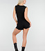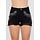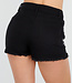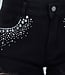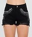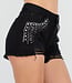 Diese Shorts sind aus robustem Denimstoff in Schwarz gefertigt. Das Modell hat eine hohe Taille und wird vorne mit einem Knopf und einem Reißverschluss geschlossen. Die Taschen auf der Vorderseite sind mit Strasssteinen verziert. Der Saum ist ausgefranst und weist leichte Destroyed-Details auf. Die Shorts sind leicht elastisch.