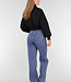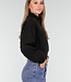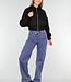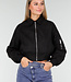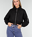 Diese schwarze, kurz geschnittene Bomberjacke hat einen minimalistischen, aber coolen Look und ist aus einem glatten Stoff mit einer leicht festen Struktur gefertigt. Die Jacke wird vorne mit einem silberfarbenen Metallreißverschluss geschlossen, der über die gesamte Länge verläuft. Die Schultern sind leicht abgesenkt, wodurch die Passform eine entspannte Silhouette erhält. Die Ärmel sind lang und etwas voluminös, mit breiten elastischen Bündchen, die für einen subtilen Balloneffekt sorgen. Auf der Vorderseite befinden sich zwei vertikal eingenähte Taschenöffnungen. Auf dem linken Ärmel ist eine Utility-Tasche mit einem vertikalen Metallreißverschluss angebracht. Der Saum ist gerade und leicht tailliert.