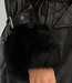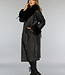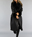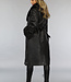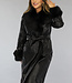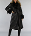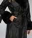 Schwarze lange Jacke in Lederoptik mit Taillenbund und Pelz