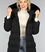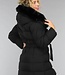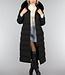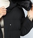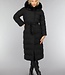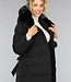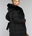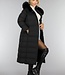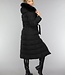 Dieser wasserabweisende Wintermantel ist lang geschnitten und gesteppt, was ihn wunderbar warm macht. Die Vorderseite hat einen Knopfverschluss mit fünf Druckknöpfen. Die Jacke hat außerdem eine Kapuze mit Fellkragen und einen Taillenbund. Der Fellkragen der Kapuze kann mit kleinen Knöpfen abgenommen werden. An der Vorderseite befinden sich zwei Reißverschlusstaschen und zwei Gürtelschlaufen, durch die man den mitgelieferten Hosenbund stecken kann.