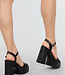 Die aus schwarzem Kunstleder gefertigten Sandalen verfügen über einen breiten Blockabsatz und eine erhöhte Plateausohle. Die Vorderseite besteht aus einem breiten Riemen über den Fuß, während der verstellbare Knöchelriemen mit einer silberfarbenen Schnalle versehen ist. Die Spitze ist quadratisch geformt und das Modell ist an den Zehen und der Ferse offen, was eine luftige Passform ermöglicht. Die Plateausohle sorgt dafür, dass der Fuß weniger einknickt, was ein angenehmeres Laufgefühl vermittelt.