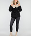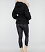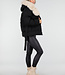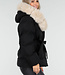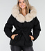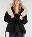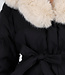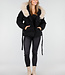 Schwarze Steppjacke mit Gürtel und beigem Pelzkragen