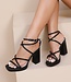 Diese schwarzen Sandaletten haben einen breiten Blockabsatz, eine erhöhte Vorderseite und mehrere dünne Riemchen über dem Vorderfuß. Die Riemchen kreuzen sich um den Knöchel und werden mit einer verstellbaren Schnalle geschlossen. Die Sohle, der Absatz und die Riemchen sind in einem einheitlichen Schwarzton gehalten.