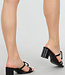 Diese Sandalen in Schwarz haben einen niedrigen Blockabsatz und eine quadratische Kappe an der Spitze. Das Modell besteht aus zwei schmalen Riemen und einem breiteren Riemen über dem Spann mit einer großen Schnalle in passender Farbe. Die Schnallen sind bei den beiden Sandalen unterschiedlich, eine ist rund und die andere rechteckig. Die Ferse und die Zehen sind offen. Die Sohle ist komplett schwarz und auf den Rest des Schuhs abgestimmt.