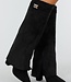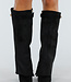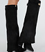 Diese schwarzen Stiefel haben einen weit ausgestellten Schaft aus geschmeidigem Material in Wildlederoptik. Der Stiefel hat eine spitze Zehenpartie und einen stabilen Blockabsatz mit leicht glänzendem Effekt. An der Innenseite befindet sich ein Reißverschluss, der die Passform bis zur Mitte des Unterschenkels schließt. Der obere Rand ist auf beiden Seiten mit einer goldfarbenen Schnalle verziert. Die Sohle ist schwarz und dezent profiliert.