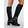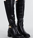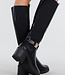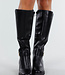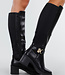 Diese schwarzen Stiefel sind aus glattem Kunstleder gefertigt und reichen bis knapp unterhalb des Knies. Der Schaft hat an der Rückseite einen elastischen Einsatz für zusätzliche Passform. An der Innenseite befindet sich ein durchgehender Reißverschluss. Um den Knöchel herum ist ein Band mit einer goldfarbenen Schnalle an der Außenseite angebracht. Der Stiefel ist mit einem stabilen Blockabsatz versehen und hat eine runde Zehenform.