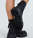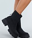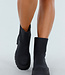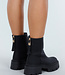 Diese schwarzen Stiefeletten haben eine robuste, klobige Sohle, die sofort für einen trendigen Look sorgt. Das Material hat eine glatte Oberfläche und die goldfarbenen Reißverschlussdetails an der Rückseite verleihen den Stiefeletten einen luxuriösen Touch.