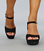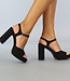 Diese weißen Sandalen sind aus einem Stoff in Lederoptik gefertigt. Sie haben einen dicken Blockabsatz und ein breites Band in Lederoptik, das über die Zehen verläuft. Die Sandalen sind durch den Schnallenverschluss am Knöchel leicht zu schließen.