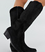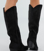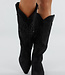 Schwarze Cowboystiefel aus Wildleder mit einer matten, leicht samtigen Textur. Die Stiefel haben einen festen Schaft bis zur Mitte der Wade, eine spitze Zehenpartie und einen niedrigen, geraden Absatz. Über den Schaft ist ein dekoratives Muster aus kleinen Glitzerdetails aufgebracht. An der Innenseite befindet sich ein Reißverschluss zum Anziehen. Die Sohle ist flach mit einer leichten Erhöhung am Absatz.