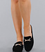 Diese modischen Loafer sind aus weichem Wildlederimitat in tiefem Schwarz gefertigt. Auf dem Rist befindet sich ein goldfarbenes Hufeisen, das für einen schicken Look sorgt. Die Slipper haben eine spitze Spitze und einen offenen Absatz, wodurch sie bequem und einfach zu tragen sind. Der niedrige Absatz sorgt für einen dezenten Auftrieb, während die flexible Sohle eine gute Passform gewährleistet. Perfekt für einen gepflegten und trendigen Look.