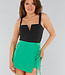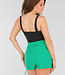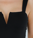 Dieser schwarze Body ist aus einem glatten Stretch-Stoff gefertigt und hat eine eng anliegende Passform. Er ist ärmellos und hat breite Schulterträger, die einen quadratischen Ausschnitt bilden. Auf der Vorderseite hat der Ausschnitt einen auffälligen V-Ausschnitt mit verstärktem Einsatz. Der Body lässt sich mit einem Knopfverschluss schließen.