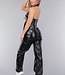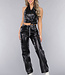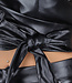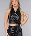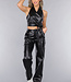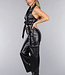 Dieses dehnbare Set in Lederoptik besteht aus einer Hose und einem Oberteil. Das Oberteil hat ein Halftermodell, das am Hals mit drei kleinen Knöpfen geschlossen werden kann. Das Oberteil hat eine Klappe mit Falten auf der Vorderseite, die einen schönen V-Ausschnitt bilden. Das Oberteil kann am Rücken mit einem Reißverschluss geschlossen werden. Das Oberteil wird durch eine Schleife auf der Vorderseite vervollständigt. Die Hose hat ein hoch tailliertes Modell mit geradem Bein aus demselben Stoff in Lederoptik. Die Hose kann mit einem einfachen Haken- und Reißverschluss geschlossen werden. Die Hose verfügt außerdem über zwei Einschubtaschen und zwei Cargotaschen auf halber Höhe des Oberschenkels, die mit Reißverschlüssen geschlossen werden können.