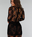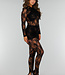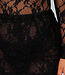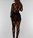 Dieser schwarze Jumpsuit aus durchsichtiger Stretch-Spitze hat lange Ärmel und einen taillierten Kragen. Der Jumpsuit hat einen Reißverschluss am Rücken, der für einen engen Abschluss am Rücken sorgt. Im Brustbereich verläuft eine gekreuzte Überlappung, die für Bedeckung sorgt, so dass dieses Teil nicht durchsichtig ist. Die Ärmel und Hosenbeine sind transparent. Um die Hüften herum verläuft ein mattierender Rock mit Falten, der eng anliegt und den Po bedeckt. Dank des Stretchmaterials liegt der Jumpsuit eng am Körper an und bietet viel Bewegungsfreiheit.