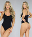 Dieser schwarze Bodysuit ist elastisch und hat ein feines Strickmuster. Der Body hat verstellbare Spaghetti-Träger am Rücken und fällt wie ein Tanga, der Body hat keine Cups. Am unteren Ende des Bodys befindet sich ein Hakenverschluss, der aus drei Haken besteht, die Sie in drei Positionen einstellen können.