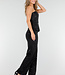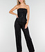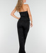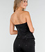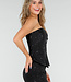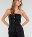 Dieses Oberteil ist trägerlos und hat eine taillierte Passform, die die Silhouette betont. Die Farbe ist Schwarz mit Glitzer. Auf der Vorderseite hat das Oberteil zwei Ziertaschen und einen Knopfverschluss mit sieben Knöpfen. Der untere Teil des Oberteils verläuft leicht konisch mit einem dezenten Schlitz in der Mitte. Der Stoff ist glatt und leicht elastisch. Auf der Rückseite des Oberteils befindet sich ein elastisches Band, damit das Oberteil perfekt sitzt. Dieses Oberteil passt perfekt zu den Stretch-Hosen!