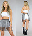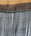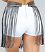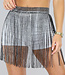Der schwarze Glitzer-Fransen-Minirock hat schimmernde Steine. Auf der Rückseite des Fransenrocks ist er mit einem Kettenhaken auf verschiedene Weise verstellbar. Sie können ihn über einfache Unterteile oder Röcke tragen. Dieser Glitzer-Fransenrock ist ideal für ein Festival-Outfit!