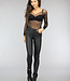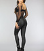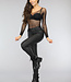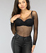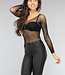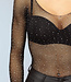 Dieser Body hat ein Fischnetzmuster und ein schulterfreies Design. Der Body ist mit einem Netzmuster und Glitzersteinen versehen. Der Body ist tailliert und schwarz. Außerdem verfügt der Body über lange Ärmel und ein Tanga-Modell. Der Body hat unten keinen Verschluss, lässt sich aber dank des Stretchanteils leicht an- und ausziehen.