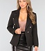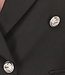 Dieser Blazer ist schwarz und hat lange Ärmel. Auf der Vorderseite befindet sich ein Knopfverschluss, der aus sechs Knöpfen besteht, von denen einer tatsächlich als Verschluss dient. Diese Knöpfe tauchen auch am Ende der Ärmel wieder auf. Die Taschen auf der Vorderseite dienen der Dekoration.